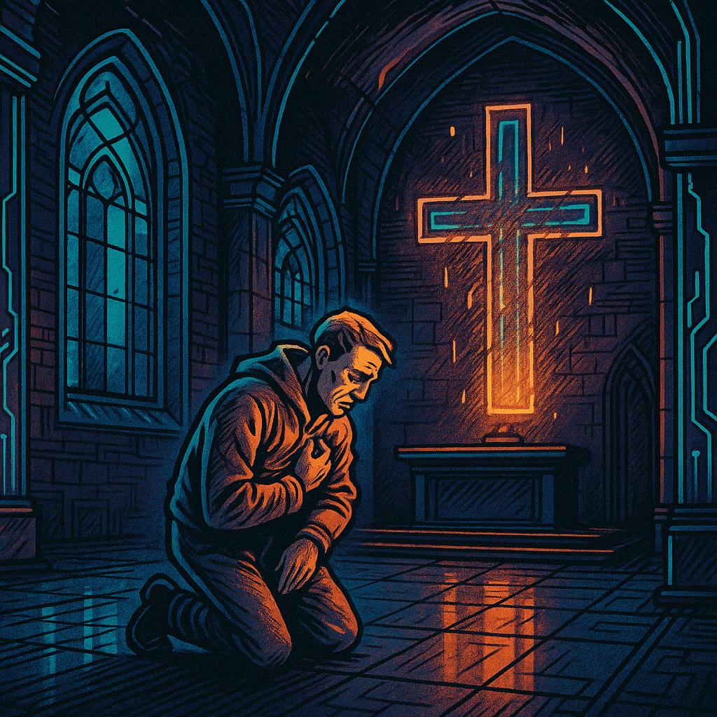 In kalter Kapelle kniet ein Mann im flackernden Licht,