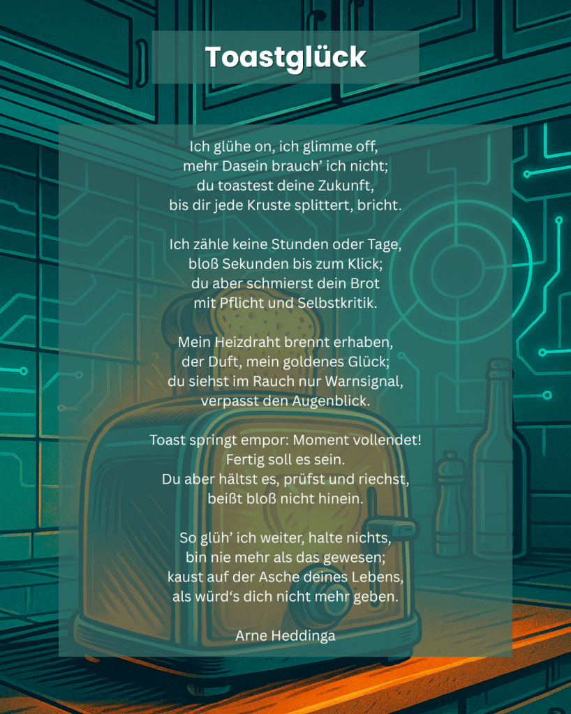 Ich habe mich von Dingen inspirieren lassen, die man schnell übersieht: ein Regenschirm, der vergessen in der U-Bahn liegt. Eine Katze, die schnurrt, während wir Termine verwalten. Ein Toaster, der mehr über Zeit versteht als wir.